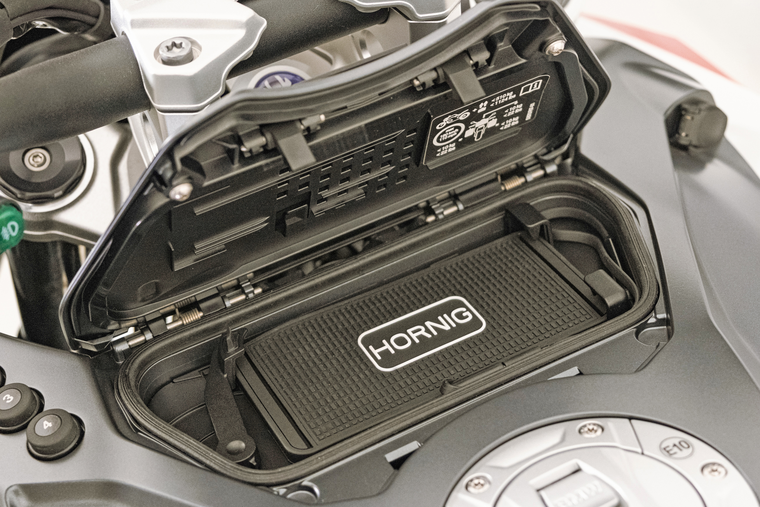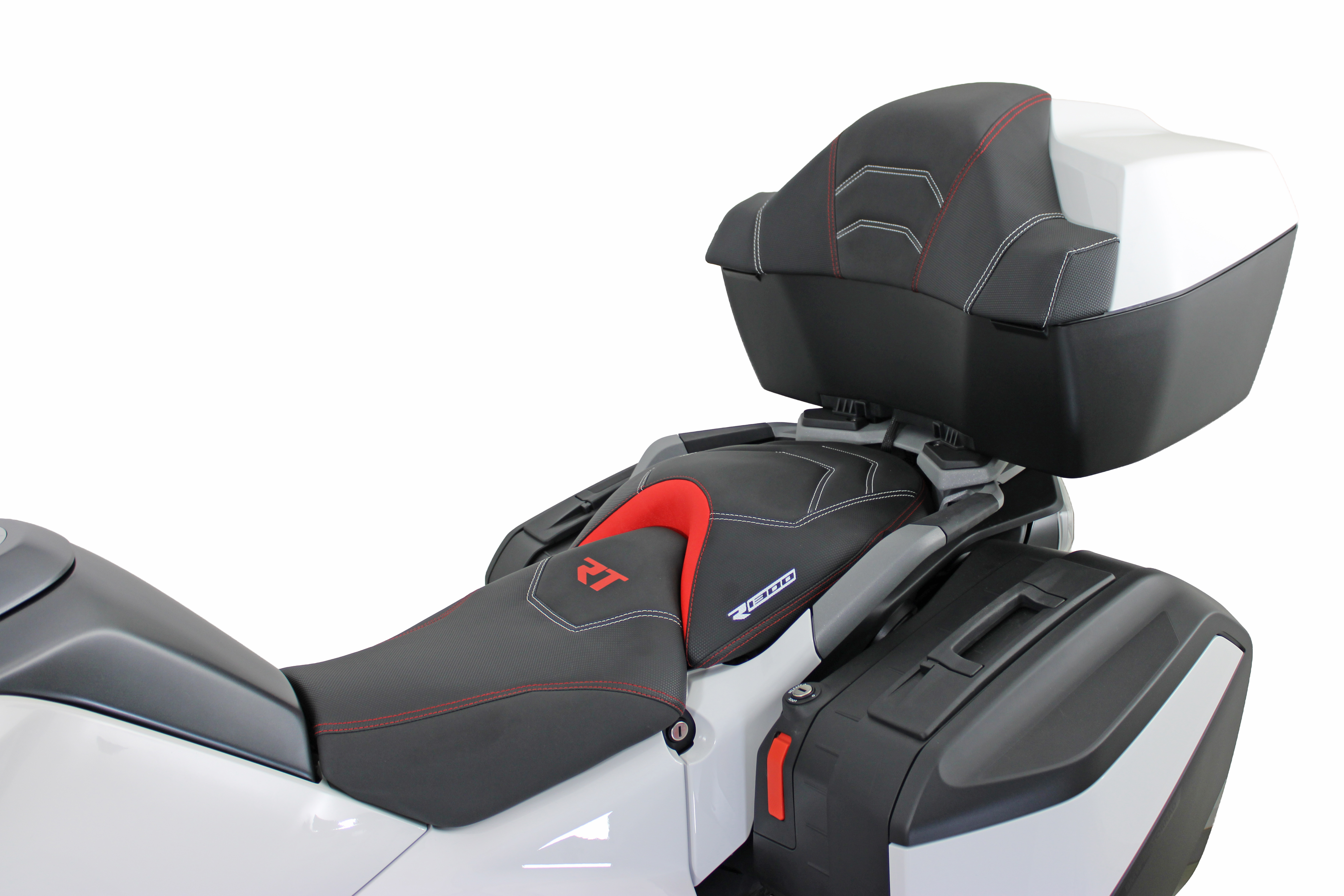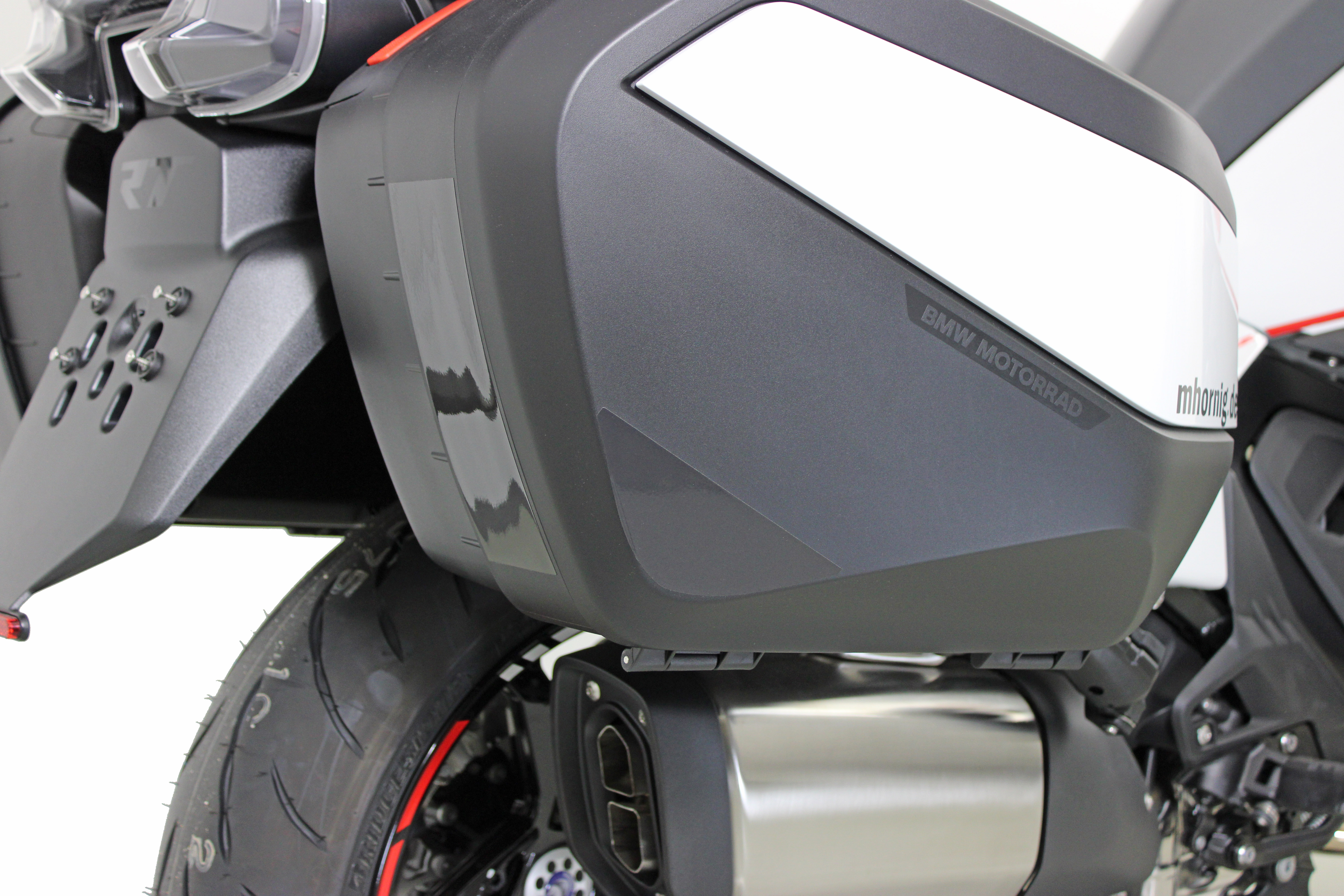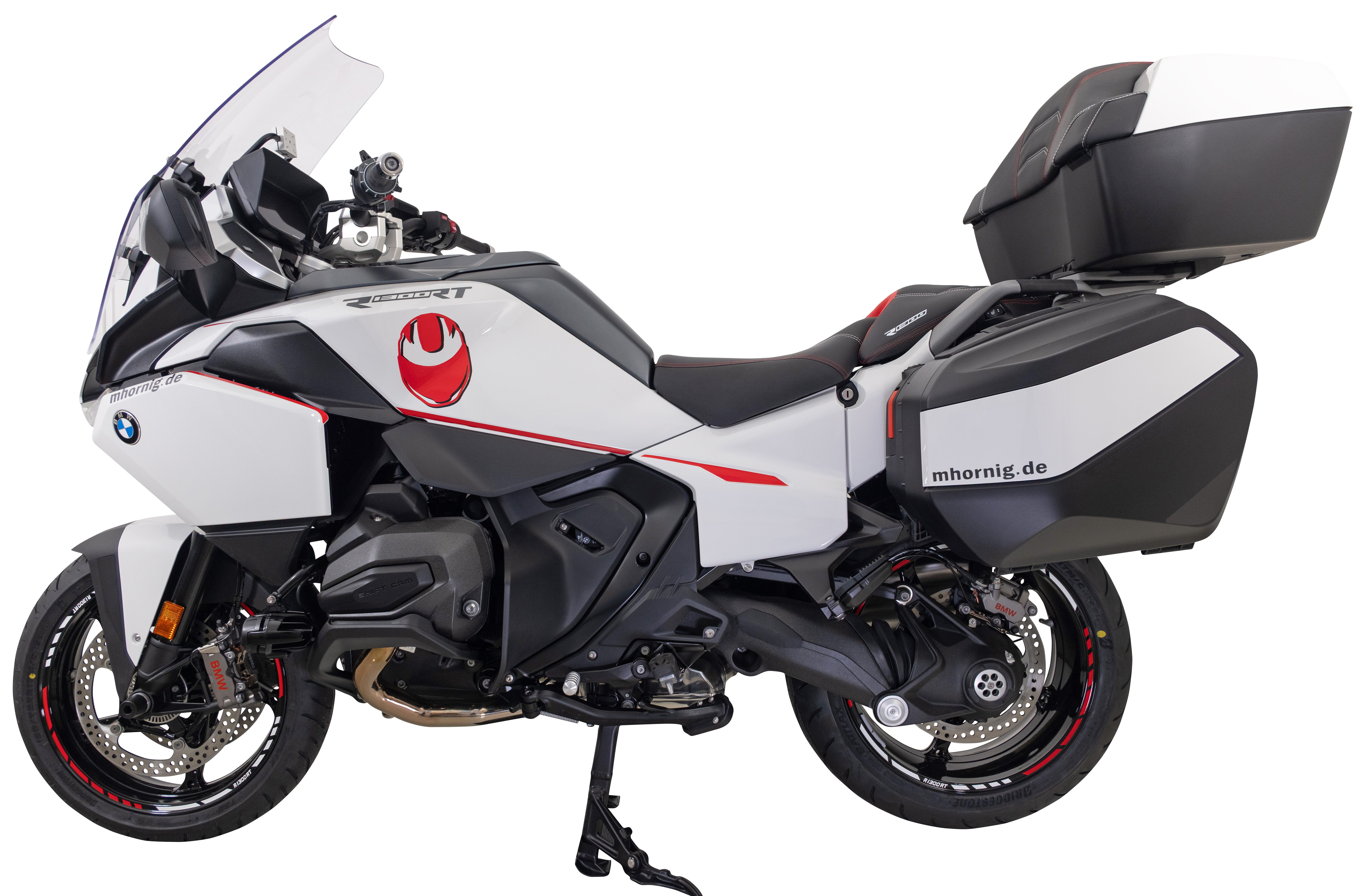 Neben Komfort und Schutz darf bei einer Premium-Touringmaschine wie der BMW R1300RT natürlich auch der persönliche Stil nicht fehlen: Wir bieten hierfür zahlreiche Möglichkeiten, die das Motorrad sichtbar veredeln und ihm ein exklusiveres Erscheinungsbild verleihen. Ein Beispiel ist die Abdeckung für den Lagerzapfen. Sie sorgt am Kardan für einen sauberen Abschluss und steigert den hochwertigen Eindruck deutlich. Ein weiteres edles Detail ist die Radachsabdeckung mit Emblem. Sie setzt nicht nur optisch ein klares Statement, sondern bringt gleichzeitig einen funktionalen Vorteil mit. Durch die spezielle Bohrungsanordnung wird ein höherer Luftstrom erzeugt, was die Kühlung positiv unterstützt. Gerade diese Kombination aus Design und Nutzen machen unsere Produkte für die BMW R1300RT so attraktiv. Auch im Cockpitbereich findet man hochwertige Details mit klarer Wirkung. Die silber eloxierte Lenkkopfverschlusskappe aus Aluminium fügt sich mit ihrer matten Oberflächenstruktur perfekt in das Design des Motorrades ein. Das mittig platzierte Hornig-Emblem sorgt dabei für eine dezente, aber wirkungsvolle Aufwertung. Dank hoher Oberflächenhärte und ausgeprägter Korrosionsbeständigkeit ist dieses Bauteil nicht nur optisch überzeugend, sondern auch für dauerhaften Einsatz ausgelegt. Ein O-Ring sorgt bei der Montage für festen Halt und dichtet zugleich zuverlässig gegen Staub und Feuchtigkeit ab. Ein echter Eye-Cather in Bezug auf Individualität ist der aufwendige Sitzumbau. Beim Fahrersitzumbau kommen verschiedene Lederarten, eine Doppelnaht sowie der „RT“-Schriftzug zum Einsatz. Der Soziussitzumbau wird ebenfalls mit unterschiedlichen Lederarten, Absteppungen, Doppelnaht und Schriftzug links und rechts umgesetzt. Abgerundet wird die Veredelung durch den Rückenpolsterumbau, der wiederum mehrere Lederarten, Absteppungen und eine Doppelnaht beinhaltet. Das Ergebnis ist eine handwerklich hochwertige Optik, die Individualität und Touring-Charakter perfekt miteinander verbindet. Auch die sportlichen Designlinien werden gezielt hervorgehoben. Der rote Dekor-Aufkleber-Satz wurde passgenau für die linke und rechte Seite der BMW R1300RT entwickelt und sorgt dafür, dass Formen und Konturen des Motorrads noch stärker zur Geltung kommen. Ergänzend dazu sorgen Felgenrandaufkleber in weiß und rot für auffällige Farbakzente, die das Erscheinungsbild abrunden und die Individualität stilvoll komplettieren.
